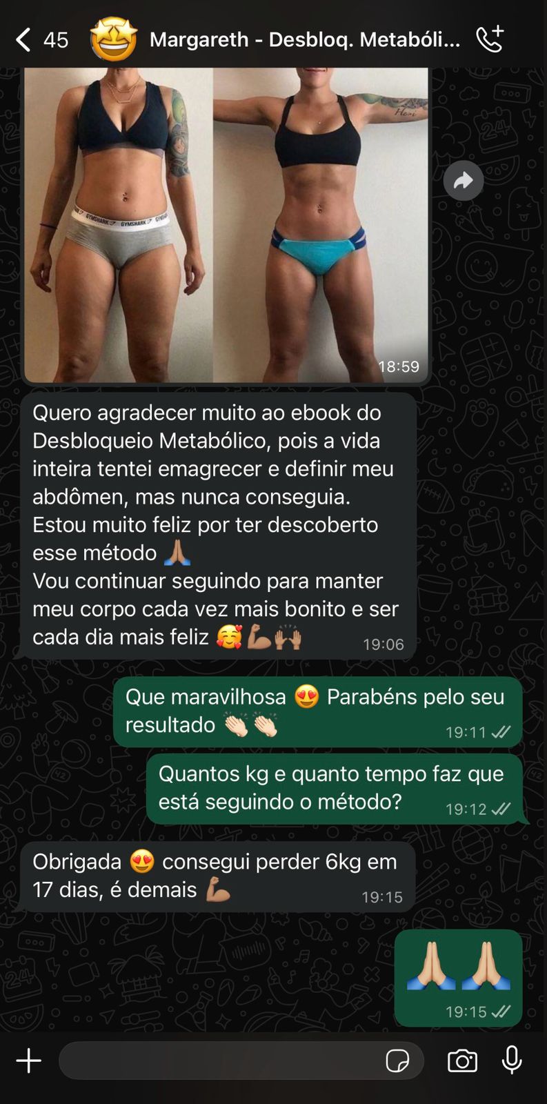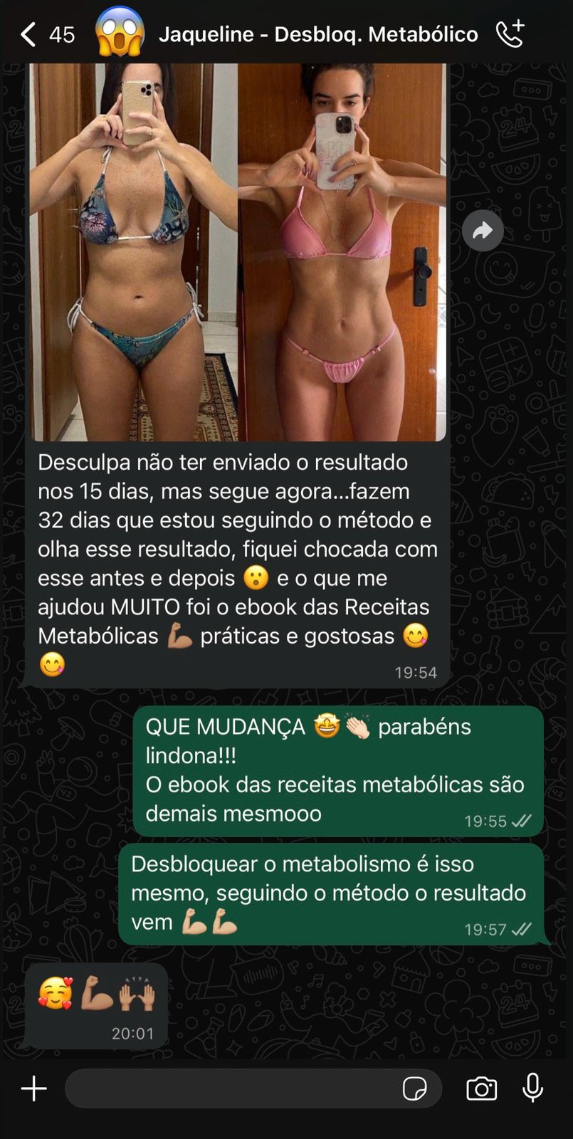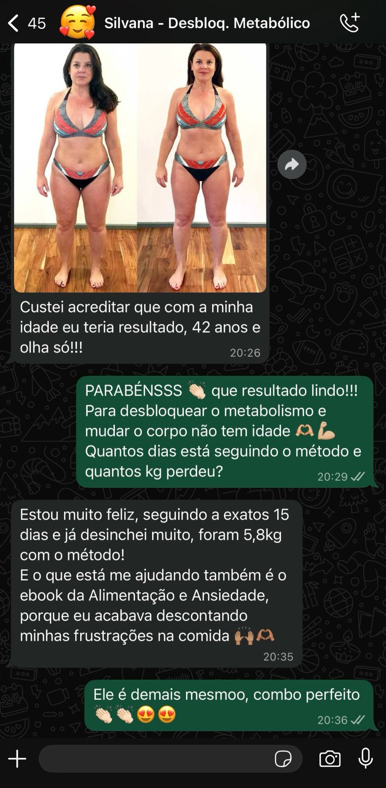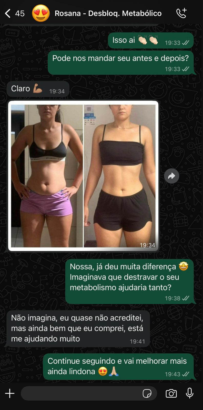 Meu maior medo era cair em mais uma dieta restrita e passar fome. Mas o Desbloqueio do Metabolismo foi diferente: me ajudou a perder 7kg e, de quebra, comecei a ver definição nas minhas pernas e cintura. O inchaço diminuiu muito rápido e minha autoestima subiu lá em cima. Não troco essa sensação por nada!
